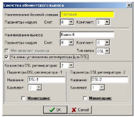 Объект «Абонентский вынос» может быть добавлен только после того, как будет выделен базовый объект – станция МС-240 с ЦПв3. В параметрах выноса задаются слот, в который установлен модуль 4DSL, и номер комплекта. Также задается тип связи (DSL/E1) и количество установленных регенераторов. Регенераторам можно задать имена и включить мониторинг (рисунок 2).