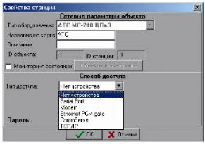 Для центральной станции задается тип доступа и IP-адреса основного и резервного ЦП.