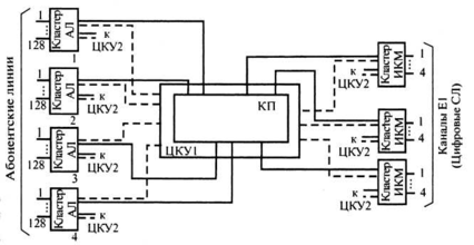 Кластер ИКМ включает в себя функциональные устройства, аналогичные абонентскому кластеру: коммутационную матрицу MUSAC, сигнальный процессор ADSP, контроллеры HDLC и управляющее устройство на базе такого же микропроцессора. Новыми узлами являются четыре микросхемы FALC, выполняющие роль интерфейсов первичных потоков (PRI) и позволяющие включать по одному каналу Е1.