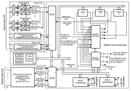 На общей плате абонентского кластера находятся: два контроллера ELIC, микропроцессорное управляющее устройство кластера УУ, две коммутационные матрицы MUSAC, три сигнальных процессора ADSP и два контроллера HDLC. Для станции до 256 номеров на общей плате может быть установлен один субмодуль ИКМ с двумя интерфейсами каналов Е1.