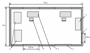 Рисунок 4.1 – План помещения: 1 - дверь; 2 – окно; 3 – стена; 4 – стойки; 5 – шкаф; 6 – стол; 7 – стул