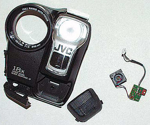 Причиной указанной неисправности вероятней всего является дефект встроенного микрофона. В качестве замены подойдет любой двухвыводный электретный микрофон подходящего размера (диаметр корпуса должен быть не более 8 мм). Внешний вид микрофона с элементами передней панели показан на рис. 1. Прежде чем заменить микрофон необходимо произвести неполную разборку видеокамеры для демонтажа передней панели 3 (рис. 1).