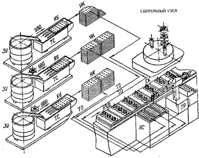 В качестве объекта рассматривается корпус электроизмерительного щитового прибора, на токовыводящие элементы которого надеваются комплекты деталей - обыкновенная и пружинная шайбы, а также цилиндрическая гайка со шлицем. В комплект входят: загрузочные (питающие) устройства ЗУ для номенклатуры комплектующих изделие деталей; устройства, выполняющие функции первичного ориентирования УПО; транспортные системы ТС и элементы создания однослойного потока деталей; устройства вторичного ориентирования УВО и фиксирования положении деталей в пространстве, например, кассетирующие устройства КУ, накопители кассет НК с упорядоченными деталями; транспортные органы ТО для подачи упорядоченных в кассетах деталей в зону обслуживания сборочного робота (создание упорядоченной среды УС): сборочный (обслуживающий) ПР; конвейер базовых деталей КБД и сборочная позиция.
