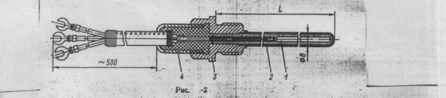 Конструкція термометра опору типу ТОП-6097, призначеного для вимірювання температури газоподібних або рідких хімічно неагресивних й агресивних середовищ у діапазоні від -50 до +250 , показана на рис.1.3. Чутливий елемент 1 платинового термометра являє собою керамічний каркас, у канали якого поміщено спіраль із платинового дроту. Кінці спирали приварені до виводів, через які чутливий елемент з'єднаний із трьохжильним кабелем. Канали каркаса засипані керамічним порошком й герметичні. Захисна арматура 2 термометра являє собою зварну конструкцію зі сталевої сурми й штуцера. Місце сполучення чутливого елемента з кабелем закривається ковпаком 4 із прес-матеріалу АГ-4В, угвинченим у верхню частину штуцера 3, і заливається компаундом.