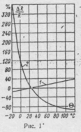 Температурна залежність опору ТСП (рис. 1.2 крива 2) досить добре описується формулою Rθ=AeВ/T, де Т – абсолютна температура, А – коефіцієнт, що має розмірність опору, В - коефіцієнт, що має розмірність температури. На рис.3 для порівняння наведено температурну залежність для мідного терморезистора (пряма 1).