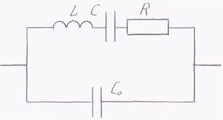 Поблизу однієї із цих резонансних частот механічних коливань пластинка кварцу з електричної точки зору являє собою двухполюсник, що складається із двох паралельних галузей.
