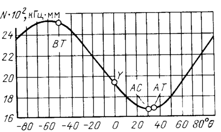 Рисунок 2.7. Залежність частотної постійної N від кута 0 для резонаторів повернених У-зрізів