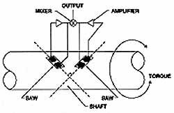 Датчик крутного моменту на пристрої з ПАХ, нерухомо прикріпленого до плоского місця на валу, й вал піддається крутному моменту, цей крутний момент піддає напрузі датчик і перетворює його в бездротової, пасивний, легкий датчик крутного моменту. Якщо вал обертається в одну сторону, тоді датчик перебуває в стані натягу, при обертанні в іншому напрямку датчик перебуває в стані стиску. У практичному застосуванні два датчики обертаючого моменту використаються таким чином, що їх центральні (осьові) лінії перебувають під прямим кутом один до одного. Таким чином, коли один датчик перебуває в стані стиску, інший - у стані натягу. Тому що обидва датчики піддаються одній температурі, сума двох сигналів мінімізує будь-які ефекти виходу параметрів під впливом температури.