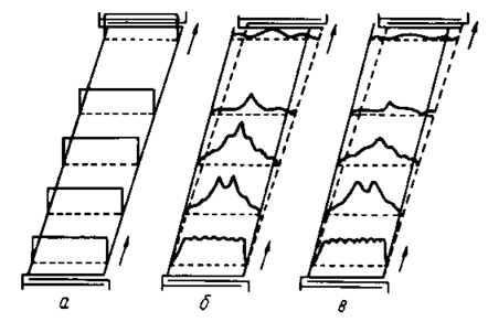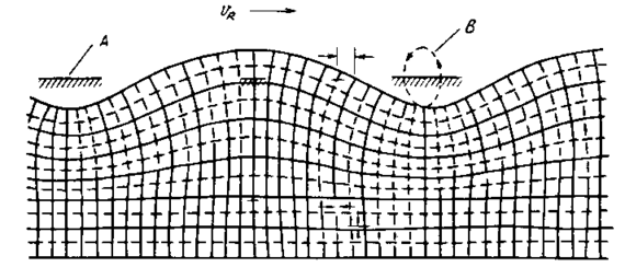 Вектор Пойнтинга паралельний напрямку поширення хвилі й швидко зменшується із глибиною (-х3). Рух середовища, викликане ПАХ Релея, наочно зображено на 5.3, де показана деформація прямокутної сітки в сагиттальній площини. Дійсні зсуви становлять величини порядку 10-5 довжини хвилі ПАХ.