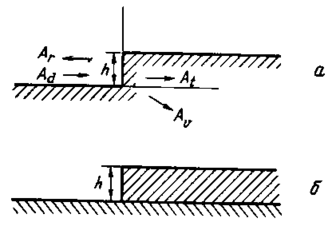 (Аd — амплітуда падаючої ПАХ, Ar— амплітуда відбитої ПАХ, Аt — амплітуда попередньої ПАХ й Аv амплітуда виниклої об'ємної хвилі.)