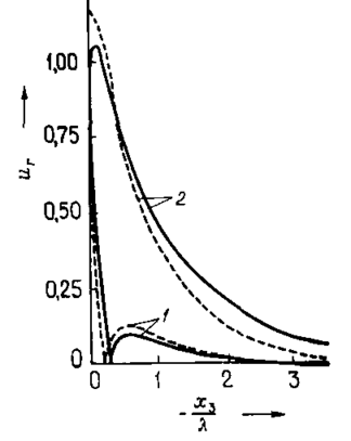 Суцільні криві відповідають вільній поверхні, переривчасті - скороченій; криві нормовані щодо амплітуди поперечної складової на поверхні.