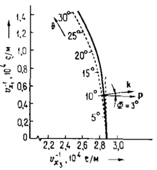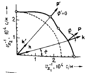 Напрямок групової швидкості, тобто напрямок потоку енергії (вектора Р), для даного напрямку поширення ПАХ, певного хвильовим вектором, задано напрямком нормалі до кривої повільності. На рис. 5.1 кут t визначає напрямок поширення й Ф — кут між векторами Р и к, тобто кут відхилення потоку енергії від напрямку поширення. Із кривої на рис. 5.1 можна визначити напрямку, уздовж яких поширюються чисті моди ПАХ (вони позначені кружечками), що характеризуються тим, що вектори Р и к колінеарні. Наприклад, для напрямків, близьких до кута υ = 90° (рис. 5.1), потік енергії ПАХ відхиляється в напрямку υ = 90°, отже, пучок ПАХ фокусується.