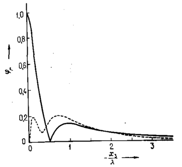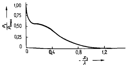 Залежність інтенсивності хвиль нормованої по одиничній амплітуді на поверхні ізотропного твердого тіла, від глибини, вираженої в одиницях довжин хвиль