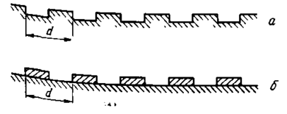 а — сходинка, утворена видаленням самого матеріалу; б — сходинка, утворена нанесенням металевого або діелектричного шару.