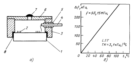 а - конструкція ТЧР; б - ТЧХ датчика LST-Зрізу; 1 - кварцова подложка; 2 - ВШП; 3 - корпус; 4 - гермоввод; 5 - кераміка; 6 - посріблена кришка; 7 - герметизирующее ущільнення; 8 - епоксидний клей