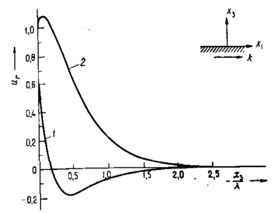 Крива 1 — поздовжня складова з негативним знаком, крива 2 — поперечна складова; криві нормовані відносно амплітуди поперечної складової на поверхні ізотропного твердого тіла.