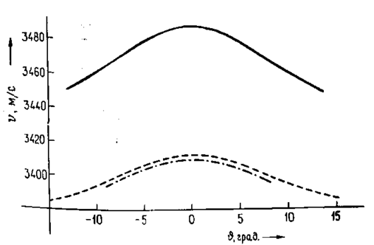 Рисунок 5.7 Залежність швидкості ПАХ, що поширюється уздовж У-зрізу кристала ниобата літію, від кута відхилення хвильового вектора (в інтервалі кутів д = ± 10°) від осі Z, обмірювана за допомогою лазерного інтерферометра