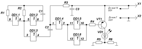 На рис.1 приведена схема випромінювача коротких імпульсів. Що дозволяє зменшити споживаний передавачем струм від джерела живлення, а значить продовжити термін служби на одній батареї живлення. На елементах DD1.1, DD1.2 зібраний генератор імпульсів, слідуючих з частотою 30...35 Гц. Короткі, тривалістю 13...15 мкс, імпульси формує диференціюючий ланцюг C2R3. Елементи DD1.4-DD1.6 і нормально закритий транзистор VT1 утворюють імпульсний підсилювач з ІЧ діодом VD1 в навантаженні.