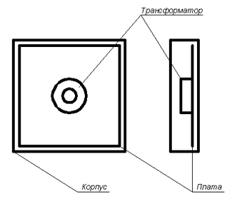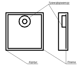 Трансформатор живлення закріплюємо двома скобами до каркасу. Це покращує технологічність виробу, бо відпадає необхідність робити додаткові елементи каркасу, а також покращує теплообмін трансформатора з середовищем, трансформатор розміщено у центрі заглиблення, за платою;