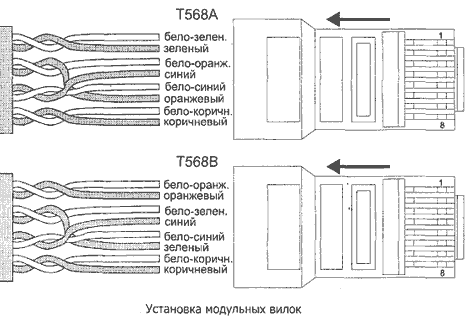 Приведенные раскладки различаются положением пар проводов, цвета проводов пар должны соответствовать стандартной последовательности синий—оранжевый—зеленый—коричневый. При монтаже структурированной кабельной системы передачи данных следует использовать 8-позиционные соединители с раскладкой EIA/TIA-568A, сокращенно Т568А (таблица ниже), или EIA/TIA-568B, сокращенно Т568В. Обе эти раскладки совместимы со всеми сетевыми технологиями. Раскладка Т568 по первым двум парам совместима с USOC RJ-61, применяемой в телефонии. Раскладка Т568В, известная и под именем АТ&Т258А или WECO, от Т568А отличается только положением пар 2 и 3. Для 6-позиционных соединителей (телефонная проводка) применяют раскладку USOC на 1 пару (RJ-11), 2 пары (RJ-14), а иногда и 3 пары (RJ-25) проводов. Есть и более «экзотические» варианты раскладки, например RJ-48X: 8-позиционный соединитель, где пары на контактах 1-2 и 4-5 запараллелены перемычками (1-4 и 2-5).