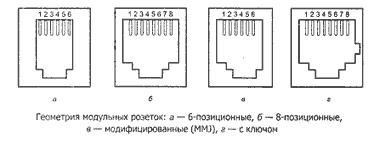 Модульные соединители Modular Jack (гнезда, розетки) и Modular Plug (вилки) являются наиболее употребимыми разъемами для 1-, 2-, 3-, 4-парных кабелей категорий 3-6. В кабельных системах применяются 8- и 6- позиционные соединители, больше известные под названиями RJ-45 и RJ-11 соответственно.
