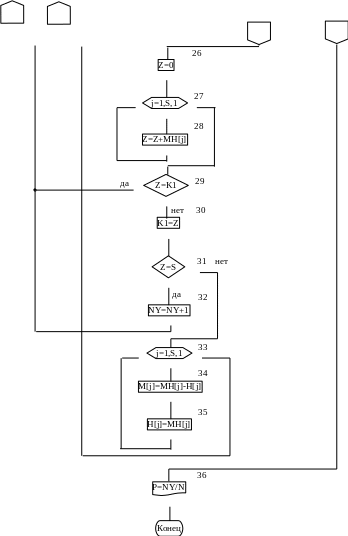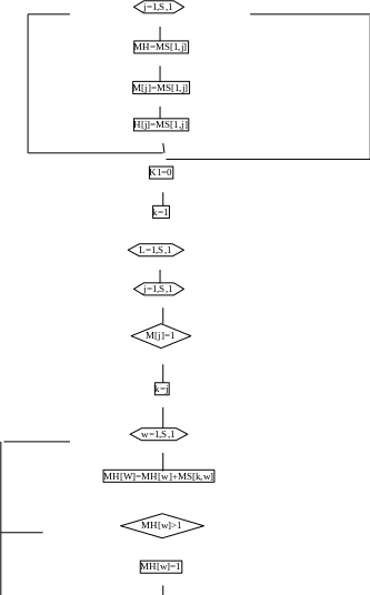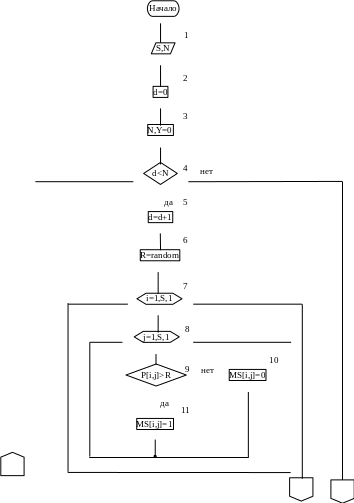Осуществляет NO независимых испытаний, каждое из которых состоит из двух этапов. На первом этапе выбирают m независимых, равномерно распределенных в интервале (0,1) чисел Xi. Затем, значения Xi последовательно сравнивают с величинами kг (i,j) по следующему алгоритму: