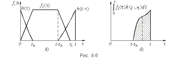 На рис. 8.6, а показан сигнал f1(t) и импульсная характеристика h(t—t), являющаяся зеркальным отображением h(t), а на рис. 8.6, б приведена свертка сигнала f1(t) с функцией h(t—t) (заштрихованная часть), численно равная реакции цепи в момент t.