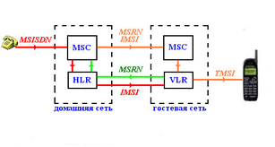 MSC пересылает в HLR номер (MSISDN) абонента. HLR, в свою очередь, обращается с запросом к VLR гостевой сети, в которой находится абонент. VLR выделяет один из имеющихся в ее распоряжении MSRN (Mobile Station Roaming Number – номер "блуждающей" мобильной станции). Идеология назначения MSRN очень напоминает динамическое присвоение адресов IP при коммутируемом доступе в Интернет через модем. HLR домашней сети получает от VLR присвоенный абоненту MSRN и, сопроводив его IMSI пользователя, передает коммутатору домашней сети. Заключительной стадией установления соединения является направление вызова, сопровождаемого IMSI и MSRN, коммутатору гостевой сети, который формирует специальный сигнал, передаваемый по PAGCH (PAGer CHannel – канал вызова) по всей LA, где находится абонент.