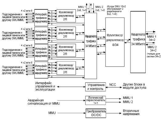 SMU – Блок ключей/мультиплексоров. SMU используется для обеспечения переключений в защищенной системе 1+1 и/или мультиплексирования/демультиплексирования каналов 2 Мбит/с.