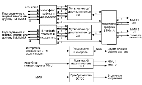Через системную шину осуществляется обмен сигналами трафика 2 или 8 Мбит/с с другими MMU или SMU того же модуля доступа.