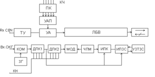 Такое построение передатчика устраняет возможность появления комбинационных составляющих в спектре доплеровских частот принимаемого сигнала, образованных частотой повторения импульсов и частотой источника питания, позволяет снизить требования к коэффициенту пульсаций источника питания. Для работы усилителя мощности при отсутствии сигнала ОКГ, через коммутатор (Ком) в схему подается сигнал собственного генератора ЗГ. Частота генератора ЗГ выбрана равной 10 МГц.