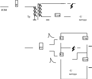 - формирование мощного импульса на потенциал земли, и затем передача его на потенциал катода с помощью импульсного трансформатора, обмотки которого изолированы на полный потенциал катода;