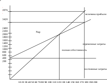 Величина полной себестоимости конструкции составляет 21.37 грн, в т.ч. переменные затраты – 14.52 грн, постоянные – 6.85 грн. Оптовая цена конструкции 24.85 грн. Определим точку безубыточности при выпуске изделий в количестве 160 шт.