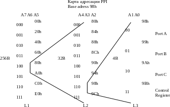 Адресация адаптера выполняется старшей частью адресов А7 - А2, адресация портов, включая регистр управления, происходит по младшим линиям А1, А0. Учитывая это обстоятельство, можно составить карту адресов памяти адаптера. Карта адресов представляет многоуровневую вложенную структуру. На самом верхнем уровне должны быть физические адреса портов адаптера. Количество уровней вложений определяется выбранной структурой дешифратора.) Карта адресации адаптера с начальным физическим адресом 98Н и представлена на рисунке 1.10.