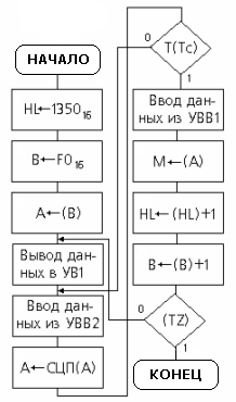 Рассмотрим алгоритм работы микросистемы. Пусть первая занятая ячейка ОЗУ имеет номер 1350h. В нее будет помещен результат опроса 1-го датчика с номером 000. Через аккумулятор и шину данных номер датчика подается на устройство вывода 1 (УВ1). УВ1 подает номер датчика на коммутатор. Коммутатор опрашивает нужный датчик и передает аналоговый сигнал на АЦП. АЦП преобразует аналог. сигнал в цифровой и передает цифровой сигнал на УВВ1. Если в первом такте импульсной последовательности Ф1 МП передает номер датчика, то во втором такте он ожидает прихода сигнала окончания преобразования от АЦП. Сигнал окончания равный 1 передается через УВВ2, через шину данных в аккумулятор. Наличие сигнала окончания аккумулятор проверяет операцией циклического сдвига вправо. Если сигнал окончания пришел, то при сдвиге вправо 1 из младшего разряда аккумулятора передается в триггер сдвига ТС, триггер сдвига устанавливается в состояние 1, и данные из устройства ввода 1 по шине данных передаются в аккумулятор, а из него в ячейку ОЗУ. Содержимое пары регистров HL и регистра В увеличивается. на 1, при этом формируется номер следующего датчика и номер ячейки, куда должен быть помещен следующий результат.