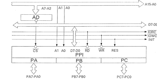 Программируемый параллельный адаптер, обычно строится на БИС программируемого периферийного адаптера PPI (Programmable Peripheral Interface) KP580BB55. В структуре микросистемы PPI представляет достаточно мощные "руки". Три восьмибитных двунаправленных порта могут поддерживать связь микро-ЭВМ с внешней средой по 24-м линиям. Аппаратно интерфейс показан на рисунке 1.9. Из рисунка следует, что проектирование схемы сопряжения заключается в разработке адресного дешифратора AD (Addres decoder ). Предполагается, что адресное пространство ввода - вывода изолировано от пространства памяти микросистемы. Последний фактор упрощает интерфейс, Поскольку адресация портов адаптера со стороны микроЭВМ производится 8-битным адресом А7 – А0, либо А15 - А8. Старшая половина адресной шины в этом случае дублирует младшую часть. В более сложных микроконтроллерных системах, где процессор окружен множеством периферийных адаптеров, вместо адресного дешифратора, применяют программируемую БИС ПЗУ. Для проектирования адресного дешифратора требуется начальный адрес PPI, являющийся адресом порта А. Адресами портов В и С служат символические адреса PPI + 1 и PPI + 2, соответственно. Адресом регистра управления CR (Control Register ) есть мнемоника PPI+3. Таким образом в адресном пространстве в 256 байт ввода - вывода адаптер занимает четыре места.