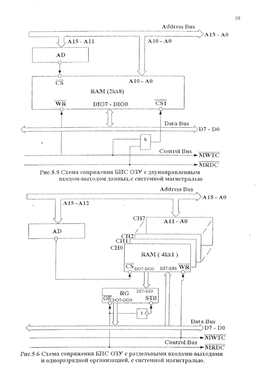 Раздельные входы-выходы данных требуют установки дополнительного буферного регистра, например КР580ИР82, разрешающего конфликтную ситуацию на шине данных. Как и ранее, адресный дешифратор выбирает блок ОЗУ ёмкостью 2кВ. На цикле чтения выбирается выходной буфер регистра. Благодаря инвертору формируется строб STB, что в свою очередь передаёт байт данных из выбранной ячейки через регистр на шину данных. При записи регистр заблокирован, а передаваемый байт из шины данных зафиксируется сигналом MWTC в выбранной ячейке. Организация интерфейса БИС ПЗУ с системной магистралью аналогично. Наиболее трудной задачей является проблема расчёта