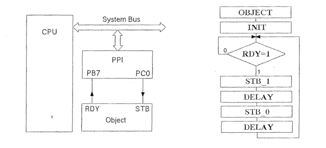 Порт В должен быть запрограммирован на ввод, а младшая половина порта С - на вывод. При готовности объекта RDY=1 программно формируется строб STB, а затем пауза. После таких действий микроконтроллер снова сканирует готовность объекта.