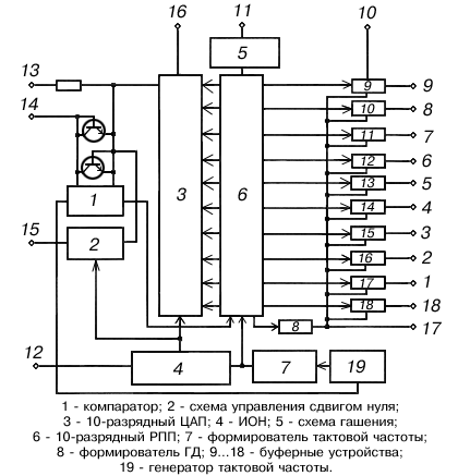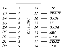 БИС АЦП К1113ПВ1 выполнена по nМОП-технологии, питается от источников питания +5В и -15В и потребляет токи 10 и 18 мА соответственно. Микросхема, выбранная для проектируемого устройства, представляет собой функционально законченный 10-разрядный АЦП последовательного приближения с временем преобразования 30 мкс.