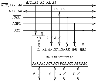 . При подаче на вход RES напряжения высокого уровня регистр управляющего слова устанавливается в состояние, при котором все каналы настраиваются на режим 0 для ввода информации (все шины портов А, В, С переходят в высокоомное состояние). При снятии сигнала со входа RES содержимое РУС не изменяется и соответственно не изменяется режим работы интерфейса.