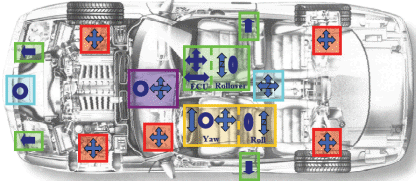Зеленим кольором на рис.3 показано акселерометри, які реагують на зіткнення автомобіля. Для цього використовується датчики типу: ADXL78/193. Для визначення перевороту використовується ADXL203 та ADXL150/300. Жовтим кольором позначено використання акселерометра в динаміці керування рухом для цього також використовуються акселерометри ADXL203 та ADXL150/300.Червоним зображено керування підвіскою машини – це ADXL103/203 ADXL213. Для навігації (фіолетовий) застосовують ADXL150/401 ADXL203.