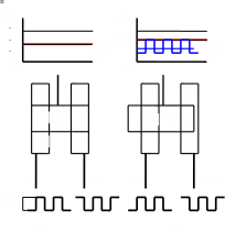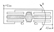 Пружинки системи підвісу рухомого вузла забезпечують гальванічний контакт з рухомими обкладками диференційних конденсаторів. Під дією сил інерції або земного тяжіння рухома частинам електромеханічного вузла може відхилятись у будь-якому напрямку в заданих межах. На поверхні підложки напроти обкладки кожного з диференційних конденсаторів, розташованих на рухомому вузлі, знаходяться нерухомі обкладки. Сигнал на виході кожного диференційного конденсатора залежить від величини зміщення рухомої частини конденсатора, зумовленого відхиленням рухомої частини електромеханічного вузла від нейтрального положення відносно відповідних частин на підложці. Принцип формування сигналу на виході диференційного конденсатора проілюстровано на рис. 23. Для вимірювання прискорення за допомогою ємнісного сенсора, побудованого із застосуванням диференційного конденсатора, в акселерометрах серії ADXL компанії Analog Devices використовується два частотних протифазних вимірювача сигналу U1 і U2. Сигнали представляють собою коливання типу «меандр», які формуються внутрішнім генератором вимірювальних сигналів.