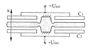 Диференційний конденсатор складається з пластини П1, яка знаходиться на рухомому вузлі, і пластин П2 і П3, розташованих на підложці. Як видно з рис.23, нерухома обкладка цього конденсатора виготовлена у вигляді двох пластин, що мають однакову форму і розміри поверхні.