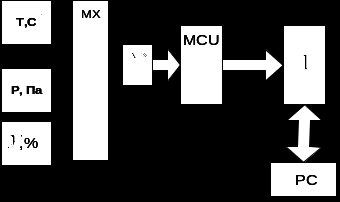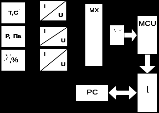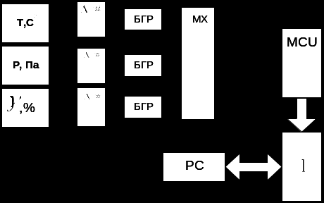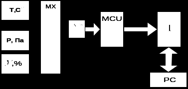Три датчика вимірюють свої фізичні величини. На виході яких після вимірювання утворюється аналогова величина, яка подається через мультирлексор на АЦП. Який перетворює аналогову величину в цифровий код. Після цього цей код поступає на мікроконтролер. А потім через інтерфейс на ПК.[2]
