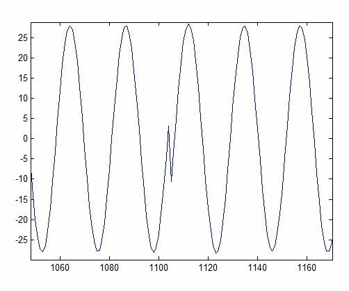 Рис. 8а Стыковка восстановленных во временную области фрагментов сигнала на выходе сформированного канала (без отбрасывания некорректных отсчетов)