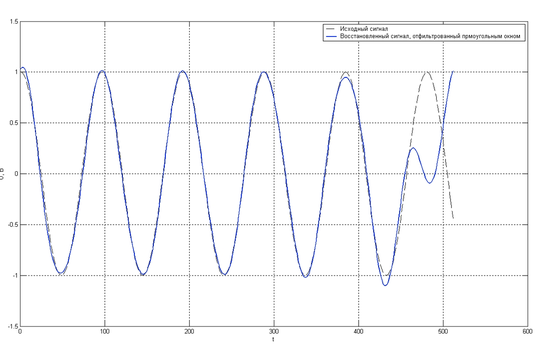 Как видно из рисунков, вырезание полосы фильтром с прямоугольной частотной характеристикой искажает амплитуду восстановленного сигнала.
