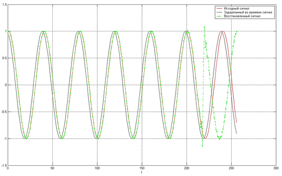 Видно, что восстановленная реализация на краю не соответствует исходной. Величина τ в этом случае положительная, но при формировании ПК в частотной области происходит сдвиг реализаций как на положительные, так и отрицательные τ.