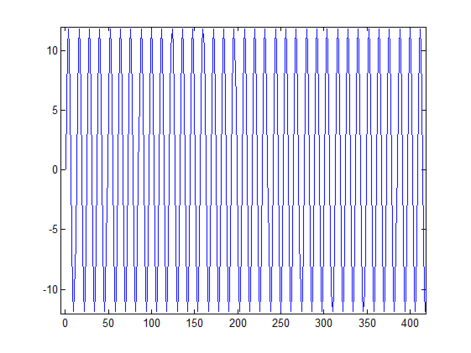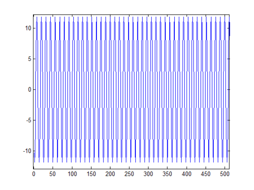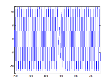 Рис 15а. Состыкованная реализация восстановленного сигнала после сдвига его полосы в частотной области на 4Δf. Перекрытие входных выборок 50%