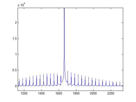 Рис.14а. Спектр восстановленного сигнала после сдвига его полосы в частотной области на 2Δf. Перекрытие входных выборок 50%