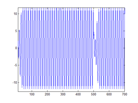 Рис 17б. Состыкованная реализация восстановленного сигнала после сдвига его полосы в частотной области на 5Δf. Перекрытие входных выборок 25%